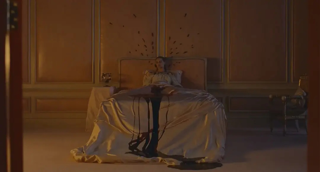 同为受害者的两个小孩,第一次产生心意的亲近是:躲在床底的希斯克利夫抓住了凯茜的脚踝。脚踝即阿喀琉斯之踵(Achilles' Heel),意指人或事物最脆弱的部分,这次的联结意味着:他们把自己脆弱的那部分敞开并交给对方。脆弱意味着什么?现代人在谈论感情时会讲,“比袒露身体更加亲密的事情是袒露脆弱”。第二次的联结是关系的递进:希斯克利夫替凯茜受过,挨了肖恩的鞭子。一个因痛苦产生的联结,承受物是皮肤。镜头给了浸着血迹的衬衣(背部)特写,下一个镜头便是成年希斯克利夫的被褥,被褥上的折痕与血迹(伤痕)同构。镜头再次对准皮肤进行特写,是模拟了凯茜偷看希斯克利夫的视角:流着汗水的结实的男性背肌——这一次,背部指向爱欲而非受伤。凯茜在婚礼前,命令侍女勒紧胸衣,背部由此受伤。接下来,丈夫给她的新婚礼物也是关于皮肤:复刻了她皮肤的墙面。该情节大胆、诡异、惊悚,是一个近乎当代艺术的呈现。而故事的结局,同样以皮肤与“皮肤墙”的毁灭而终结:凯茜死于败血症,皮肤上布满可怖的瘀斑,黑色水蛭爬满了皮肤墙。