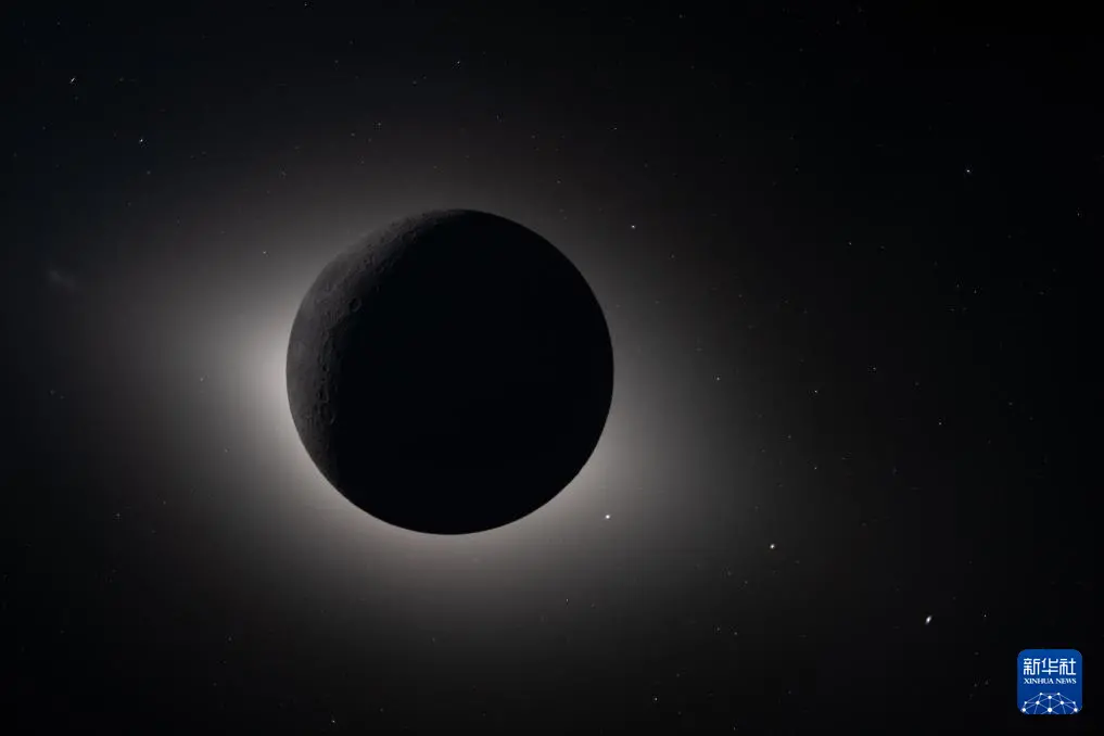 这是4月6日从执行“阿耳忒弥斯2号”载人绕月飞行任务的“猎户座”飞船上拍摄的月球完全遮住太阳的时刻。