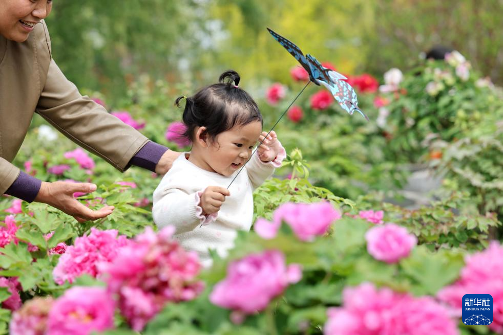 4月11日,小朋友在江苏省淮安市洪泽区西顺河牡丹园内游玩。