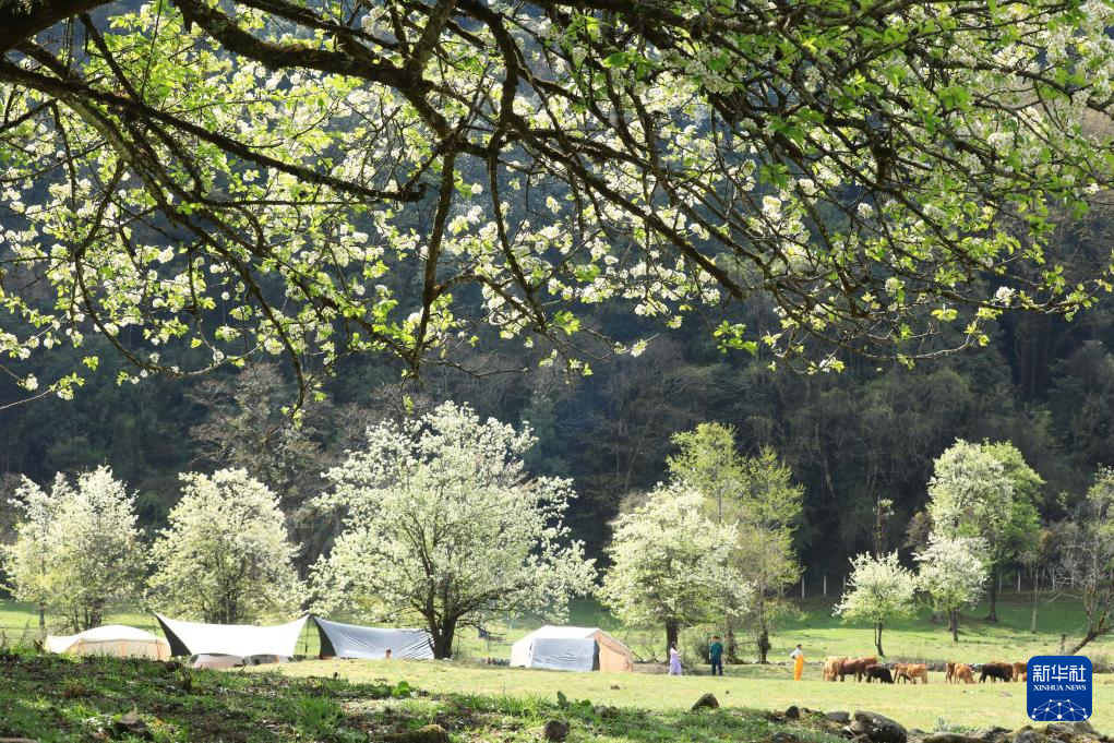 4月11日,游人在云南省腾冲市明光镇大竹坝棠梨花树间露营休闲。
