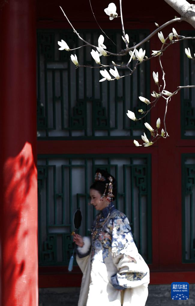 4月11日,游客在沈阳故宫赏花拍照。