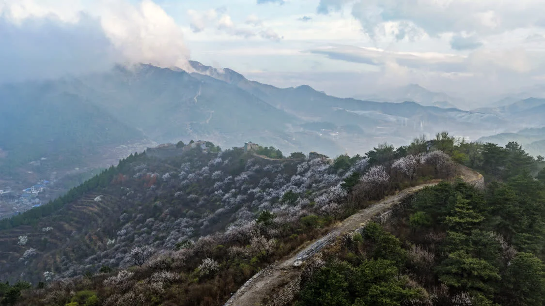 这是4月10日在河北省迁安市拍摄的雨后古长城晨景(无人机照片)。新华社发(刘满仓摄)