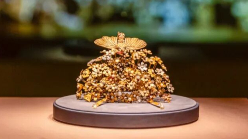 墓中还随葬了金冠饰、金手镯。插在发髻上的金冠饰也极其华丽。用金丝、金片、珍珠和宝石做成一个花丛,一只蝴蝶从上而下正在扑进花丛中。黄金冠饰在古希腊罗马和北方草原文化都很常见,李静训墓的这一从花蝶,可能是魏晋南北朝以来流行的女性发髻的装饰“步摇”,一般是用金片做成一枝带叶子的花,插在头上,走路时微微颤动。这种“步摇”受到了一些来自草原民族的影响,但是也发展出了中原文化的新特点。用蝴蝶采花,构成了迎春的主题。