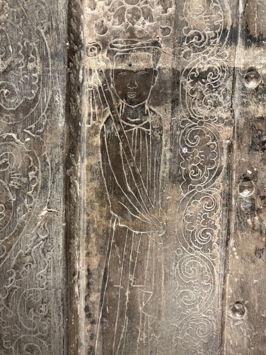 石棺两边各线刻一站立的侍女 (现收藏于西安碑林博物馆,非此次展览展品)