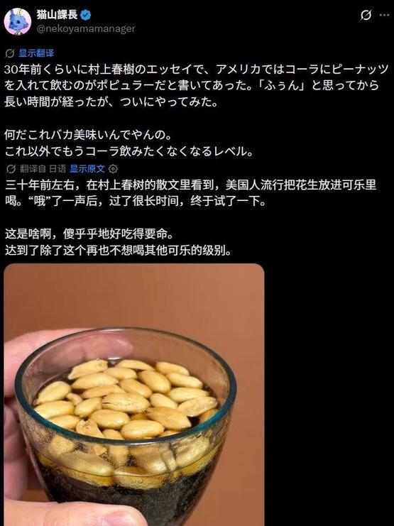 一位日本网友晒出自己在可乐杯里洒满烤花生的照片,声称这是一种“美国流行吃法”。他盛赞这种搭配美味到不行,达到了“从此再也不想喝其他可乐”的程度。