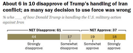 但据民调机构皮尤研究机构数据,大多数美国人表示,打击伊朗是一个错误的决定。