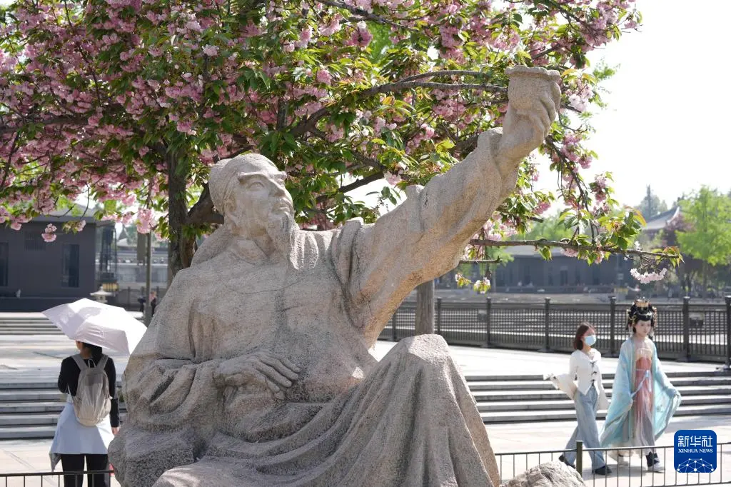 人们在西安市大雁塔北广场上诗人李白造型的雕塑附近游玩(4月9日摄)。