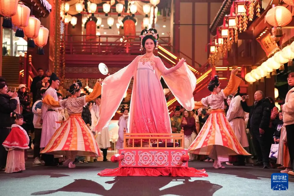 在西安长安十二时辰主题街区,演员以唐诗中的杨贵妃为主题进行沉浸式表演(2025年12月23日摄)。