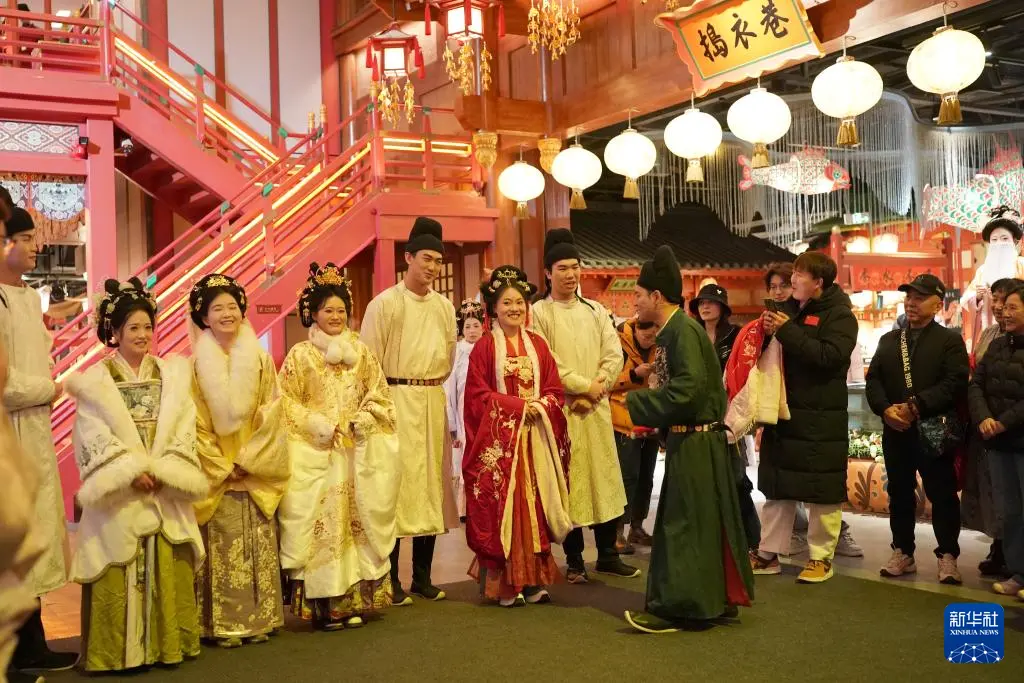 游客在西安长安十二时辰街区观赏以唐诗《琵琶行》为主题创作的沉浸式表演(2025年12月23日摄)。