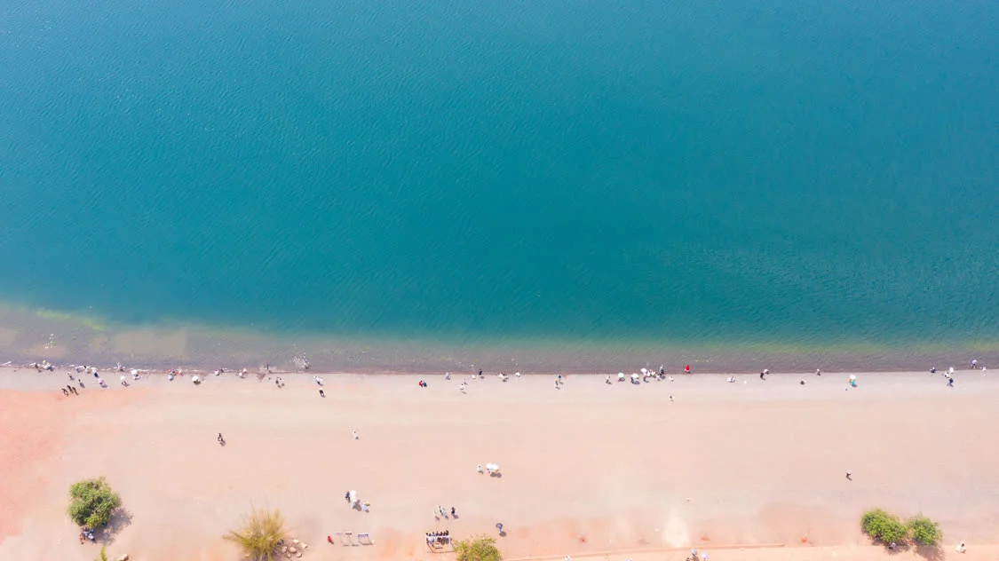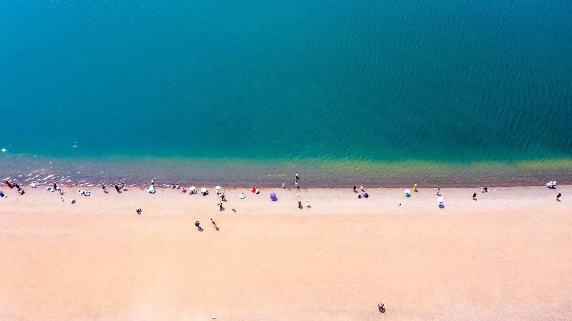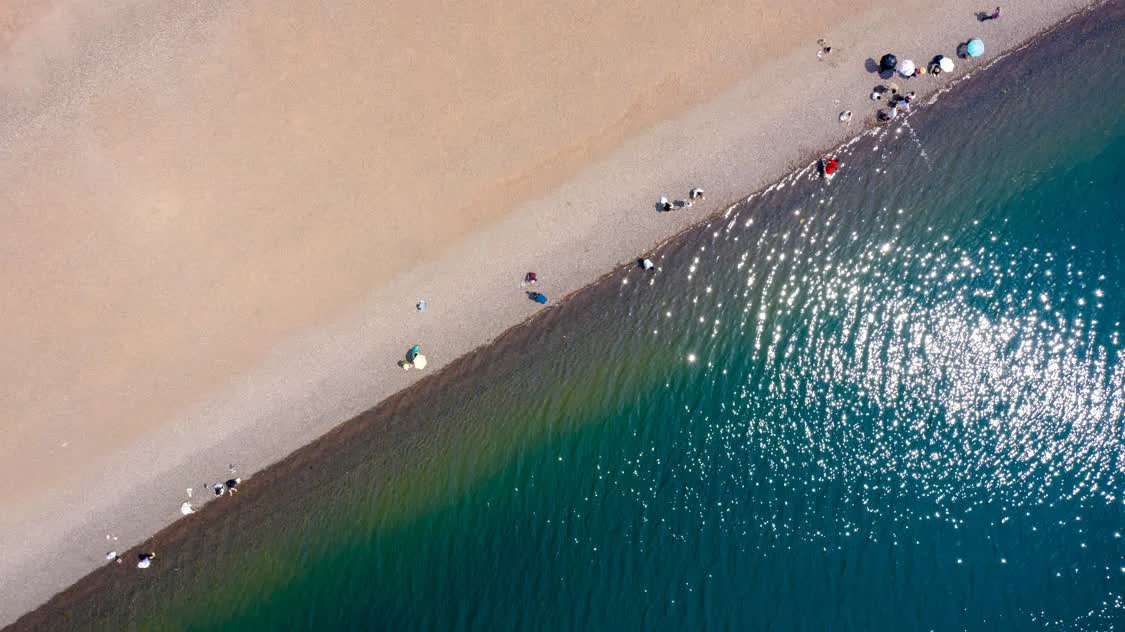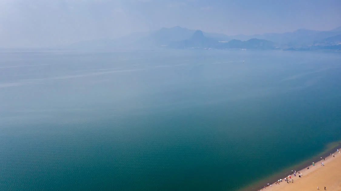 4月18日,游客在抚仙湖畔游玩(无人机照片)。 新华社记者 彭奕凯 摄