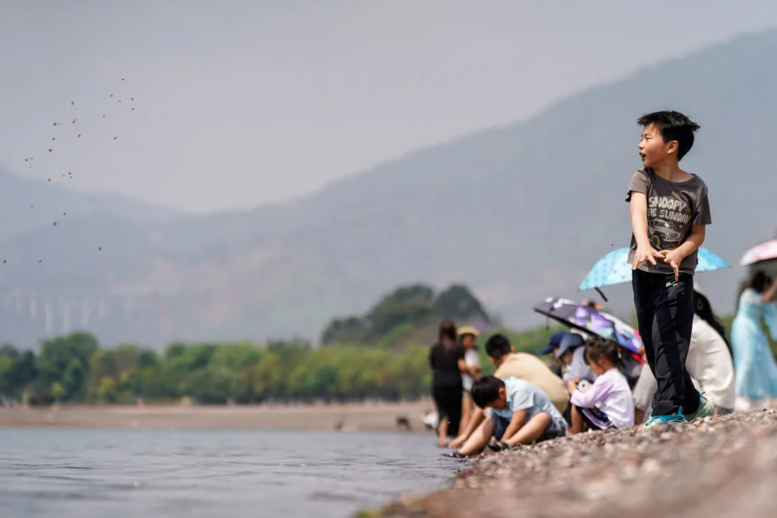 4月18日,游客在抚仙湖畔游玩。 新华社记者 彭奕凯 摄