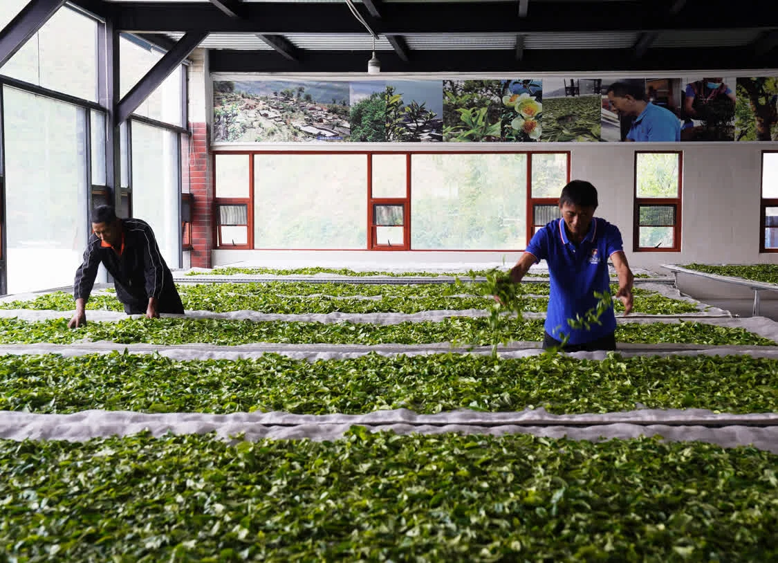 4月14日,在云南省临沧市双江拉祜族佤族布朗族傣族自治县勐库镇冰岛村,村民在晾晒刚采摘的茶叶。新华社发(梁志强摄)
