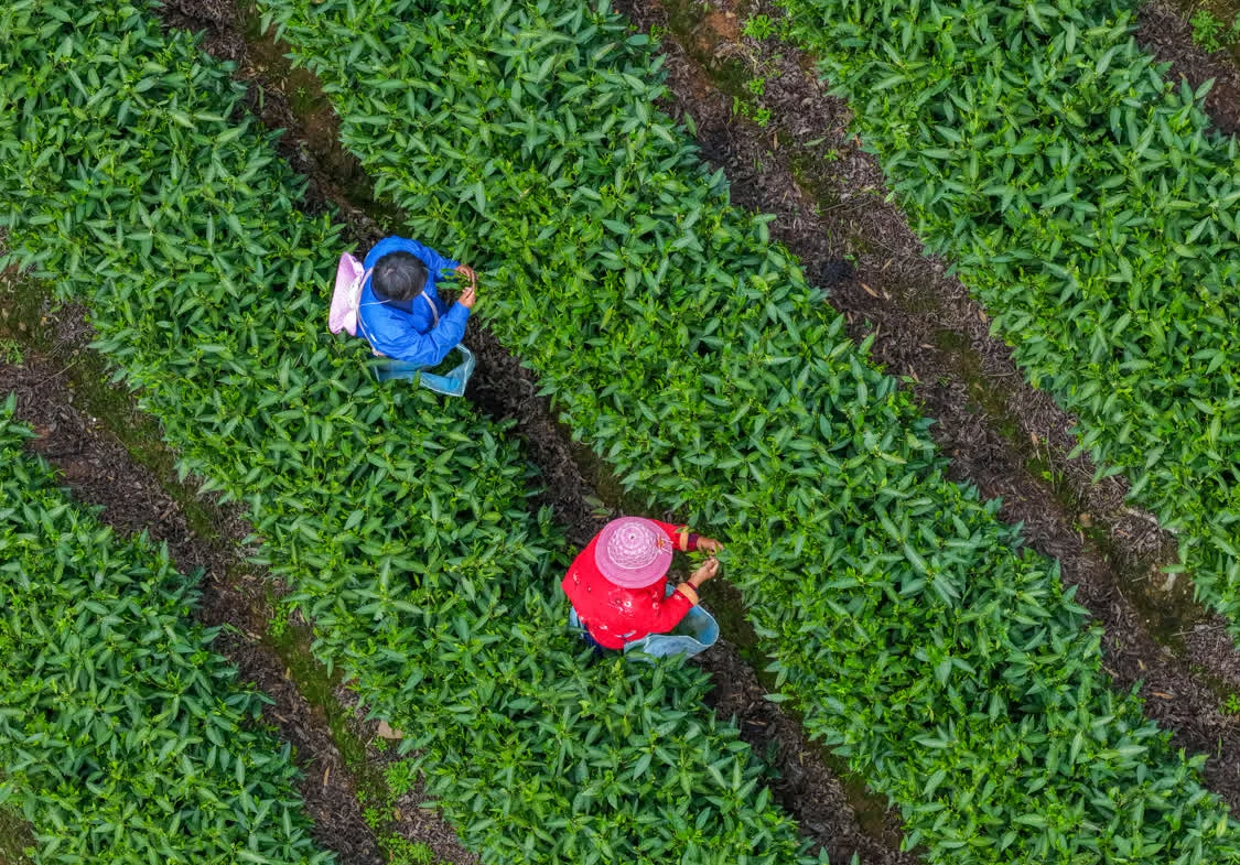4月18日,在湖北省恩施土家族苗族自治州恩施市屯堡乡花枝山村,茶农在茶园采摘春茶(无人机照片)。新华社发(文林摄)