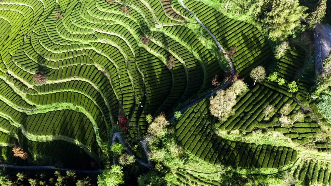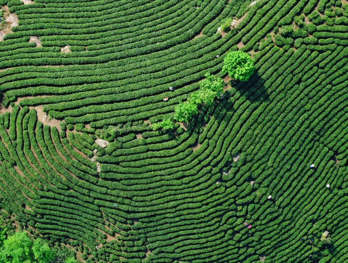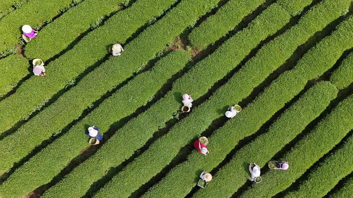 4月18日,在河南省信阳市浉河区浉河港镇郝家冲村何家寨茶山,茶农在采摘信阳毛尖(无人机照片)。新华社发(聂品摄)