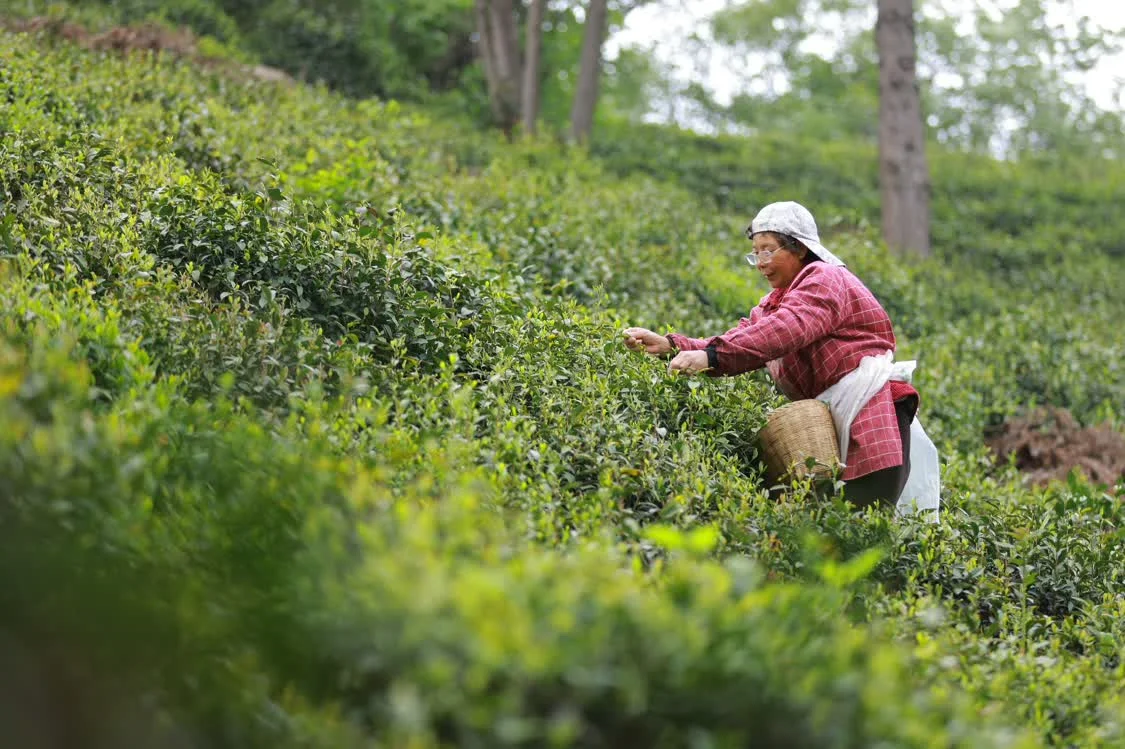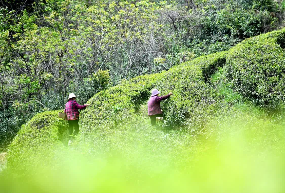 4月16日,茶农在湖北省襄阳市保康县店垭镇锅厂村生态茶园采摘春茶。 新华社发(陈泉霖摄)