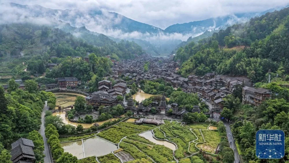↑ 4月20日拍摄的肇兴侗寨雨后风光(无人机照片)。新华社发(吴光辉摄)