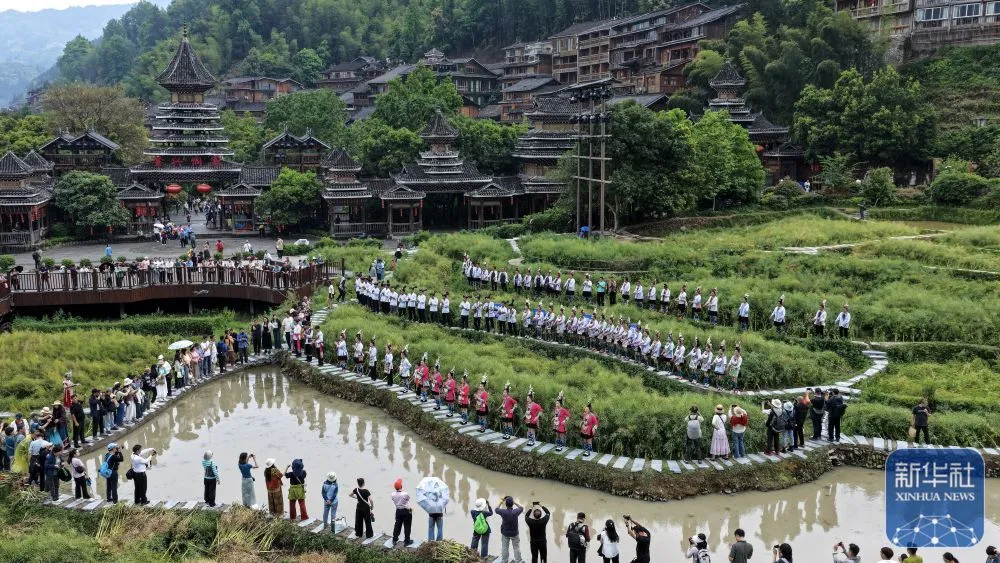 ↑ 4月20日,在肇兴侗寨的田园间,侗族歌手为游客展示侗族大歌。新华社发(吴光辉摄)