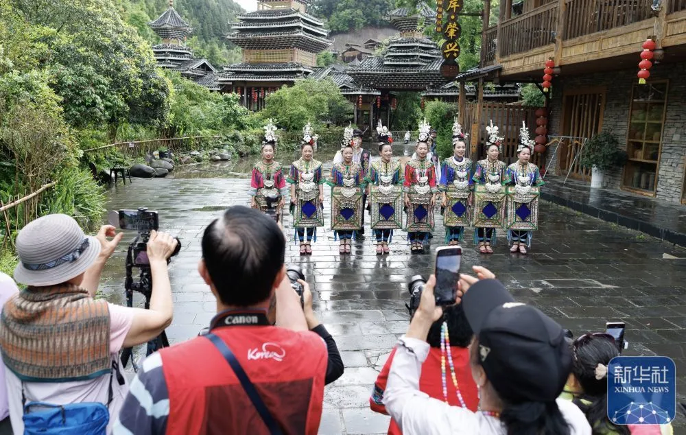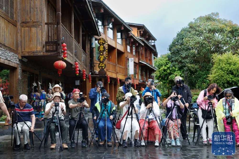 ↑ 4月20日,来自广州的旅行团团员在肇兴侗寨内拍摄。新华社记者 刘续 摄