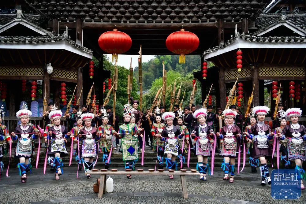 ↑ 侗族群众在肇兴侗寨为来宾举办寨门迎宾仪式(3月23日摄)。新华社记者 杨文斌 摄