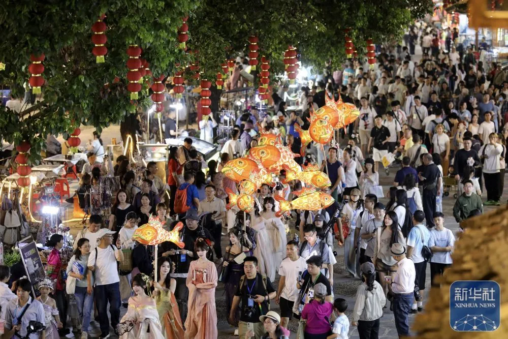 ↑ 4月18日,游人在肇兴侗寨观赏“鱼灯巡游”活动。新华社发(吴光辉摄)