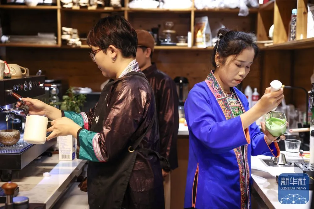 ↑ 4月20日,村民付王梅(右)在肇兴侗寨鼓亭全景咖啡馆里为顾客制作茶饮。新华社记者 杨文斌 摄