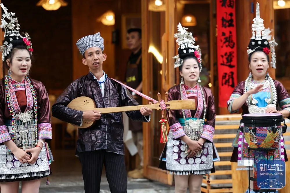 ↑ 4月20日,肇兴侗寨一家餐馆的员工在给游客弹唱侗族琵琶歌。新华社记者 杨文斌 摄
