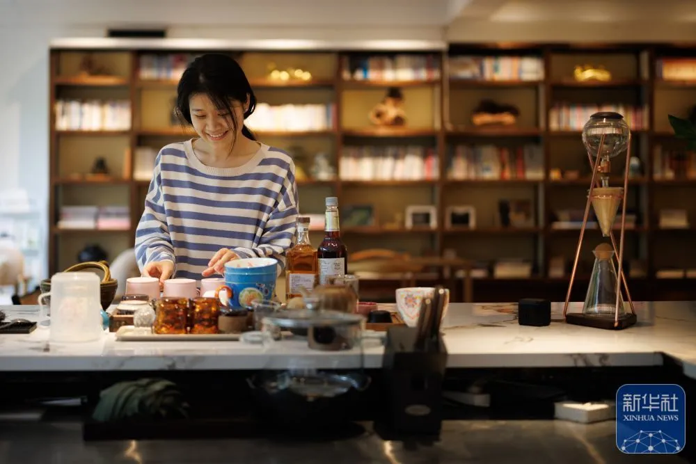↑ 4月20日,侗族女孩杨晓情在肇兴侗寨的一家民宿内整理杯子。新华社记者 刘续 摄