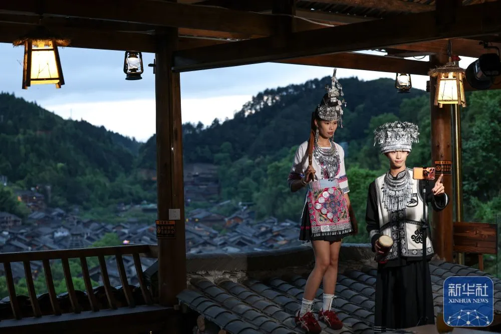 ↑ 4月20日,游客在肇兴侗寨鼓亭全景咖啡馆打卡拍照。新华社记者 杨文斌 摄
