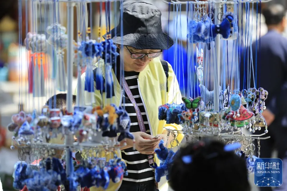 ↑ 4月18日,游客在肇兴侗寨选购文创工艺品。新华社发(吴光辉摄)