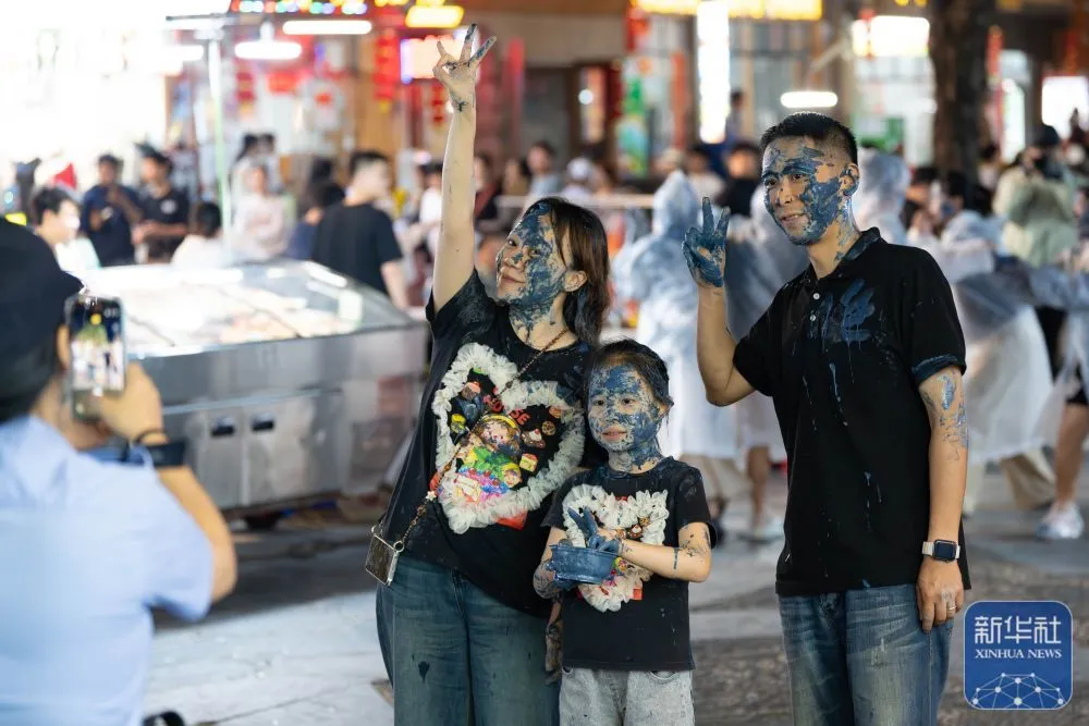 ↑ 4月18日,在贵州省黎平县肇兴侗寨内参与谷雨节“打花脸”活动的游客在合影留念。新华社发(龙建睿摄)