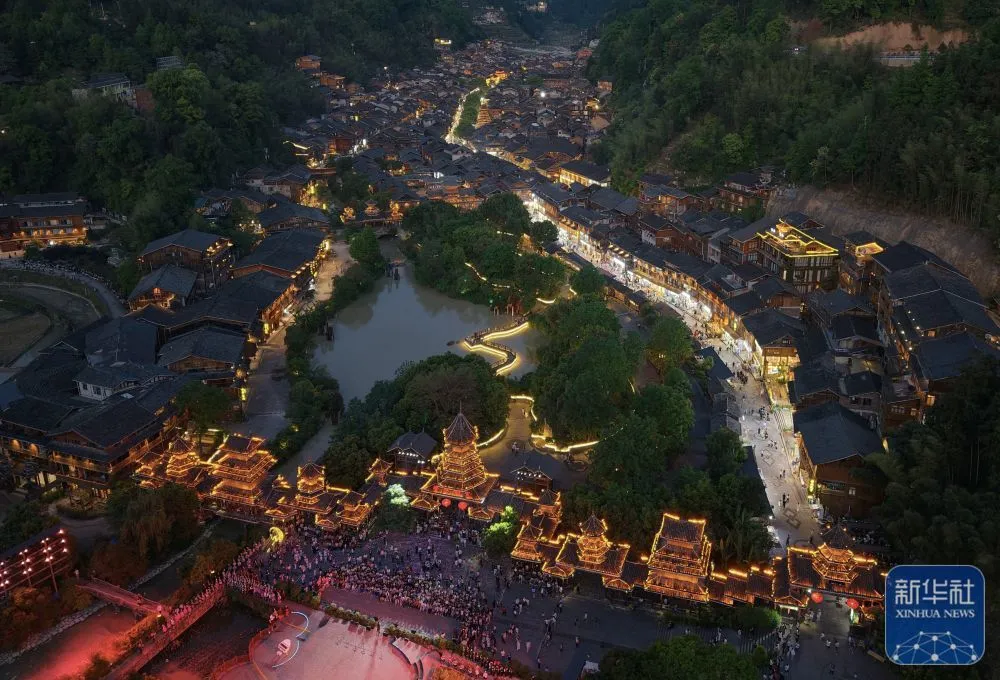 ↑ 4月18日,游客云集夜幕下的肇兴侗寨欣赏表演(无人机照片)。新华社发(吴光辉摄)