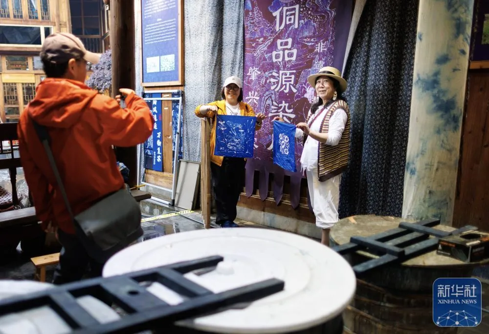 ↑ 4月20日,游客在肇兴侗寨内体验非遗项目靛染。新华社记者 刘续 摄