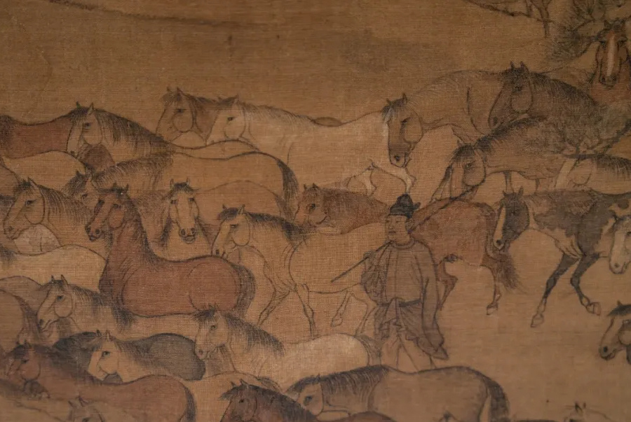 北宋大家李公麟的《摹韦偃〈牧放图〉》卷同样引人注目。图中沙阜连绵,河流隐现,142名牧官驱赶着1247匹官马自右向左行进,再现了盛唐官牧的磅礴气势。马匹骨肉停匀、形象生动,用笔自然写意。虽为临摹唐人韦偃之作,但李公麟的创造性处理极为突出。