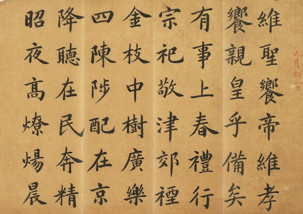《迎送神歌》为颜延之(384-456)《南郊登歌三首》中第二首,是祭祀时迎接和送别神灵的乐歌。整体乍看下似乎相当成熟,细看则发现许多处理力有未逮,习惯性的用笔可在雍正十二年(1734)习作中见到,推测书于宝亲王时期(1733-1735)。