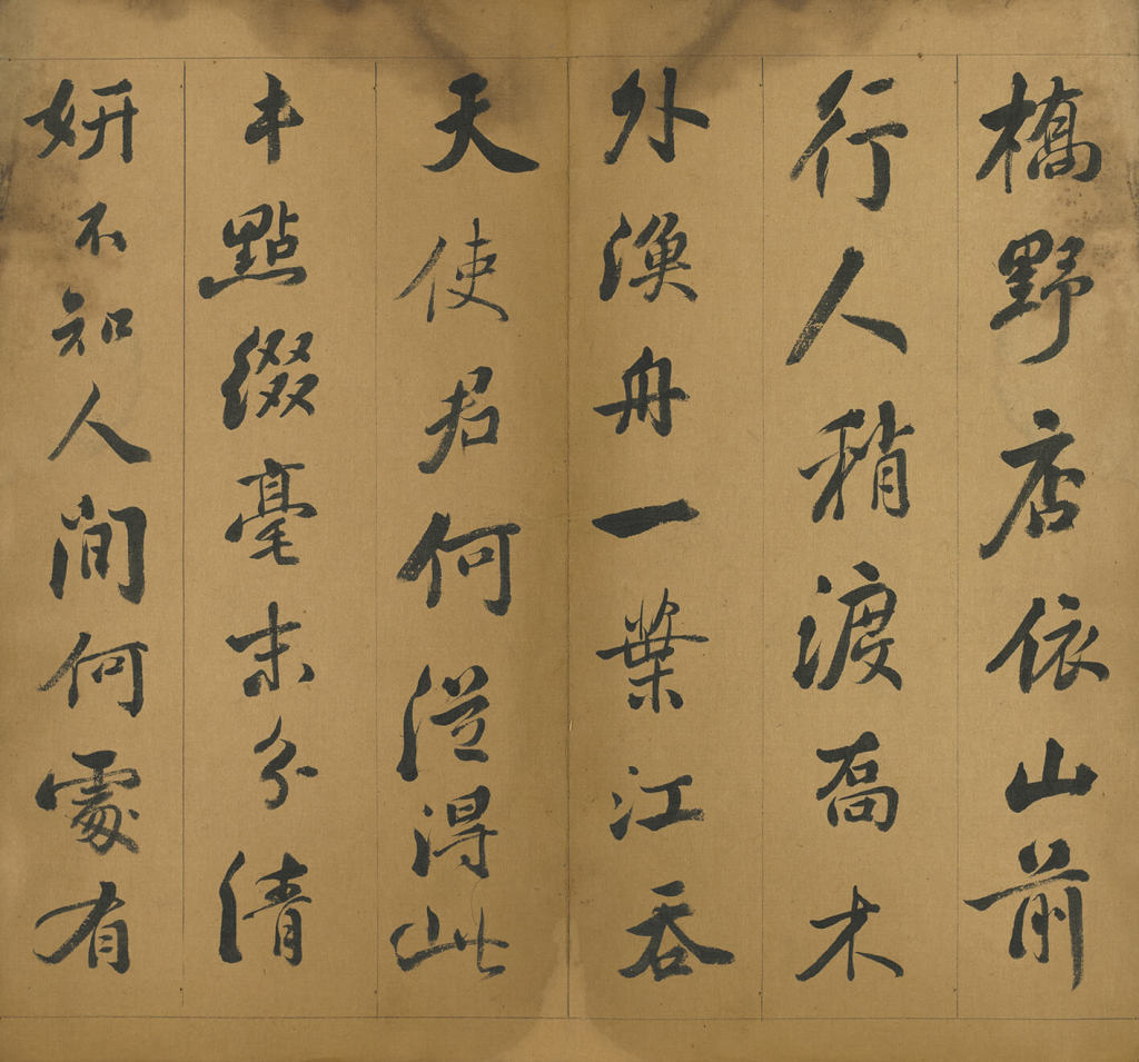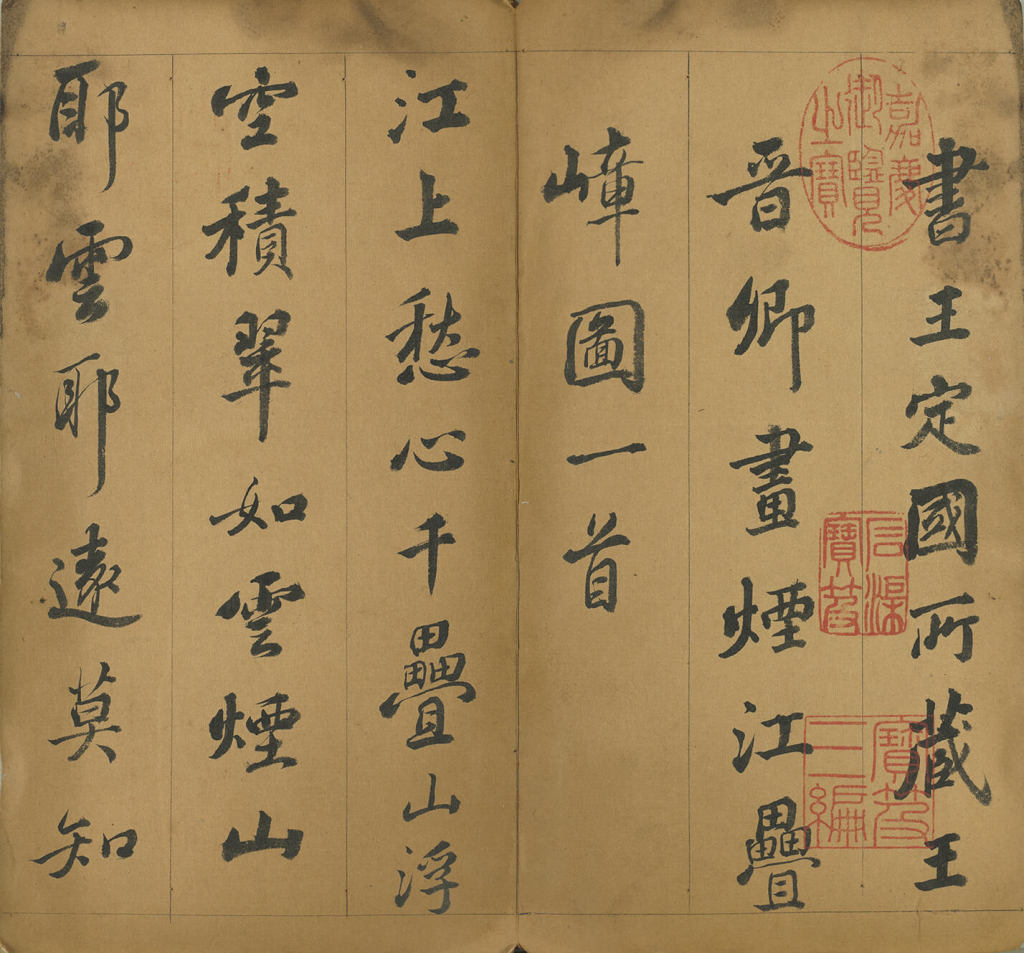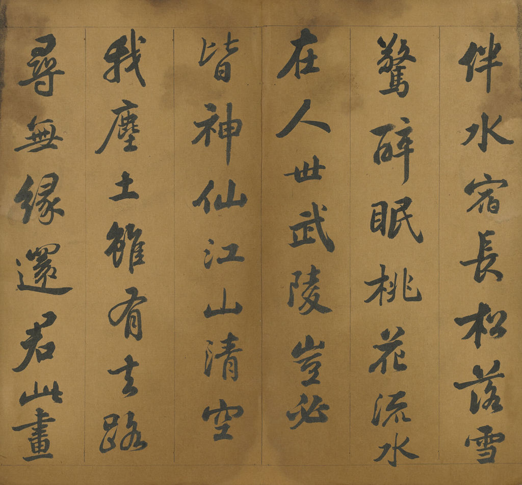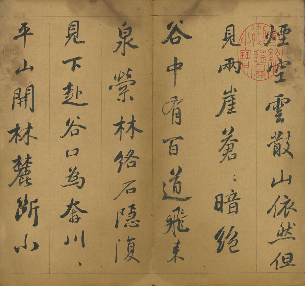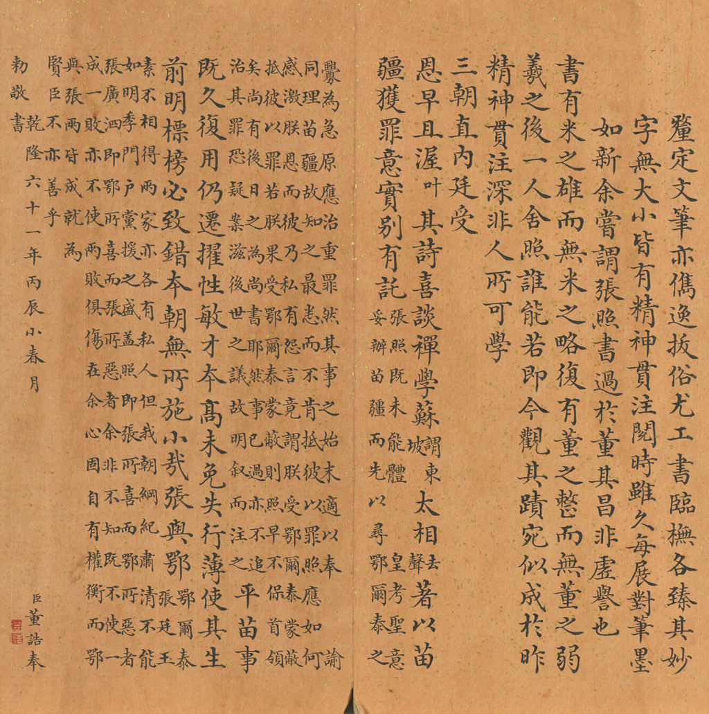 诗中赞叹大自然的雄伟,强调此景蕴含尊师重道与学问追求的内涵,书于乾隆二十年(1755)。线条圆厚,墨色自然,严谨中带有变化,显示出专业书家水准,为汪由敦(1692-1758)所代笔。