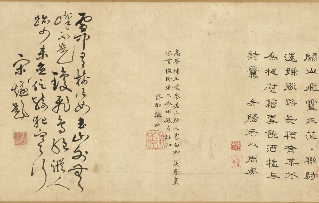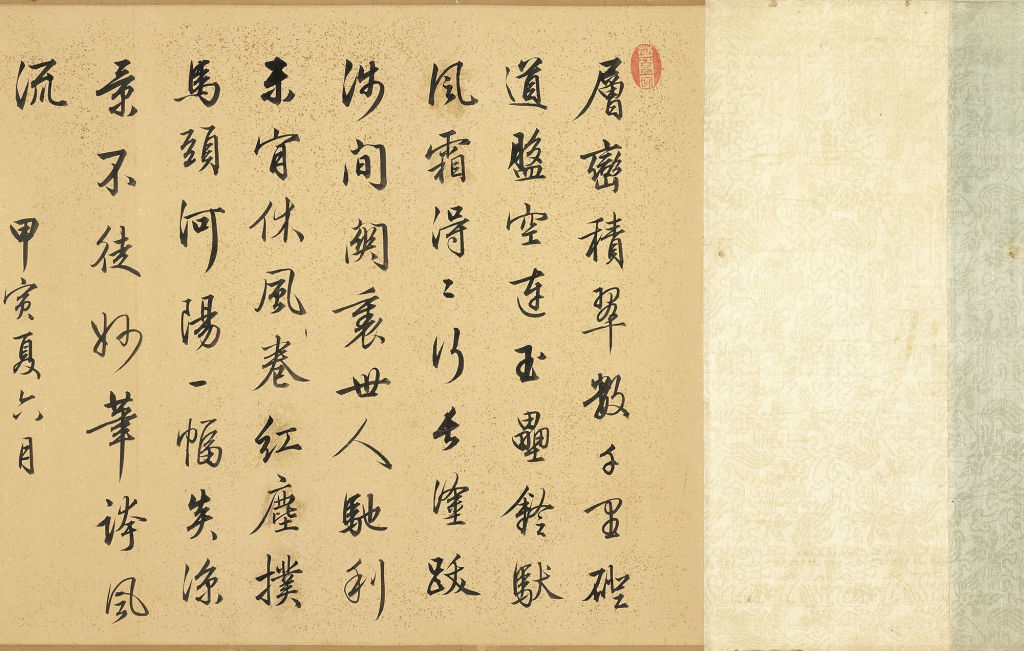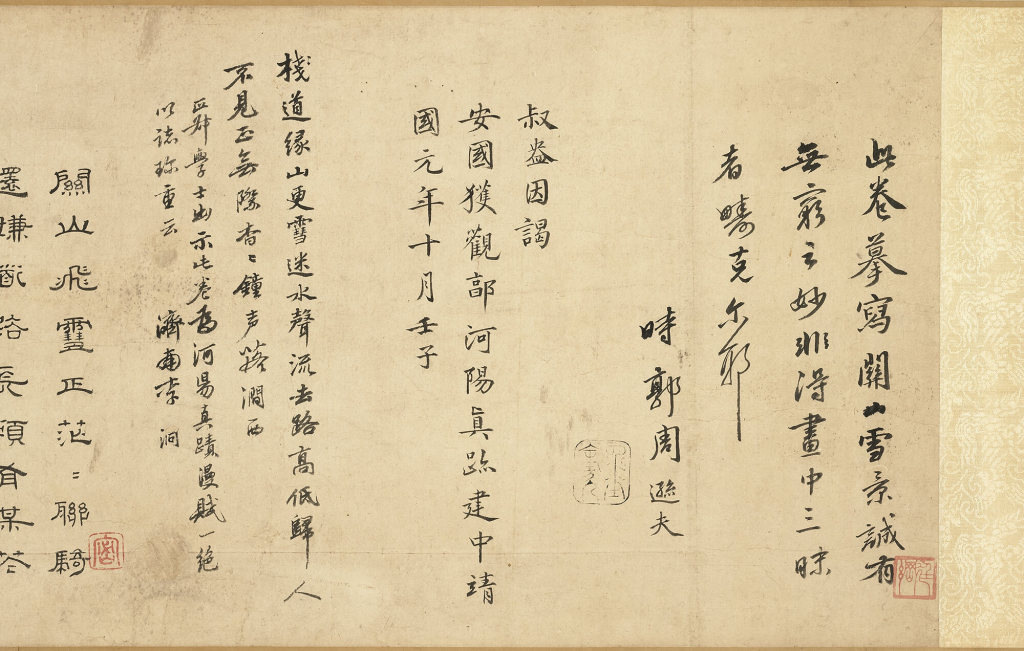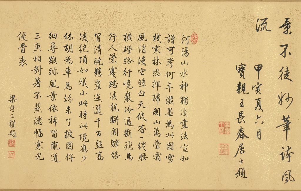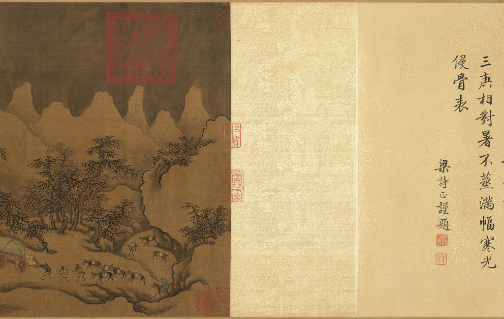 宝亲王弘历的题诗描绘了壮阔画面、艰险旅途和辛勤商队,同时也表达从景象中所获得的人生哲理。秀美书风及精致用笔,都能在后面梁诗正(1697-1763)题诗中见到,可知也是出自梁之代笔。