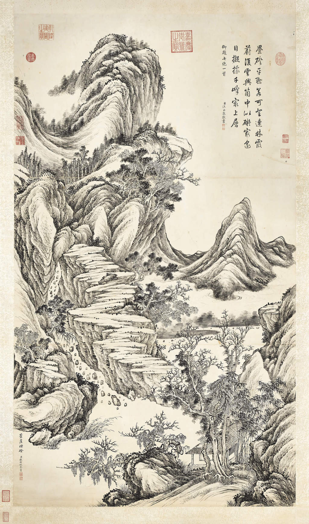 钱维城(1720-1772),字稼轩,号茶山。江苏武进人,山水与董邦达(1699-1769)齐名。此画笔法苍劲,构图奇特,陡峭石阶悬挂山间,连绵树林沐浴在霞光和云气中,营造出高远幽深的意境。
