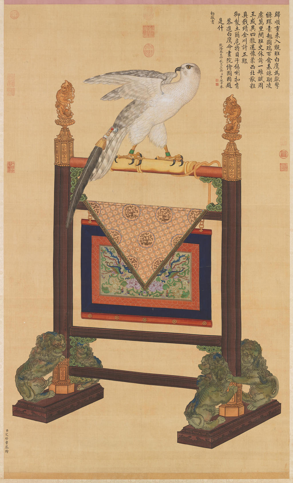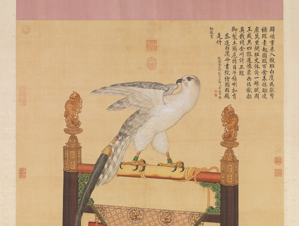 艾启蒙(1708-1780),字醒庵,波西米亚(今属捷克)人。天主教耶稣会传教士,从郎世宁(Giuseppe Castiglione,1688-1766)学画,入内廷供奉。白鹰颇具动势,尾端鹰铃、羽饰和鹰架等皆仔细刻画。