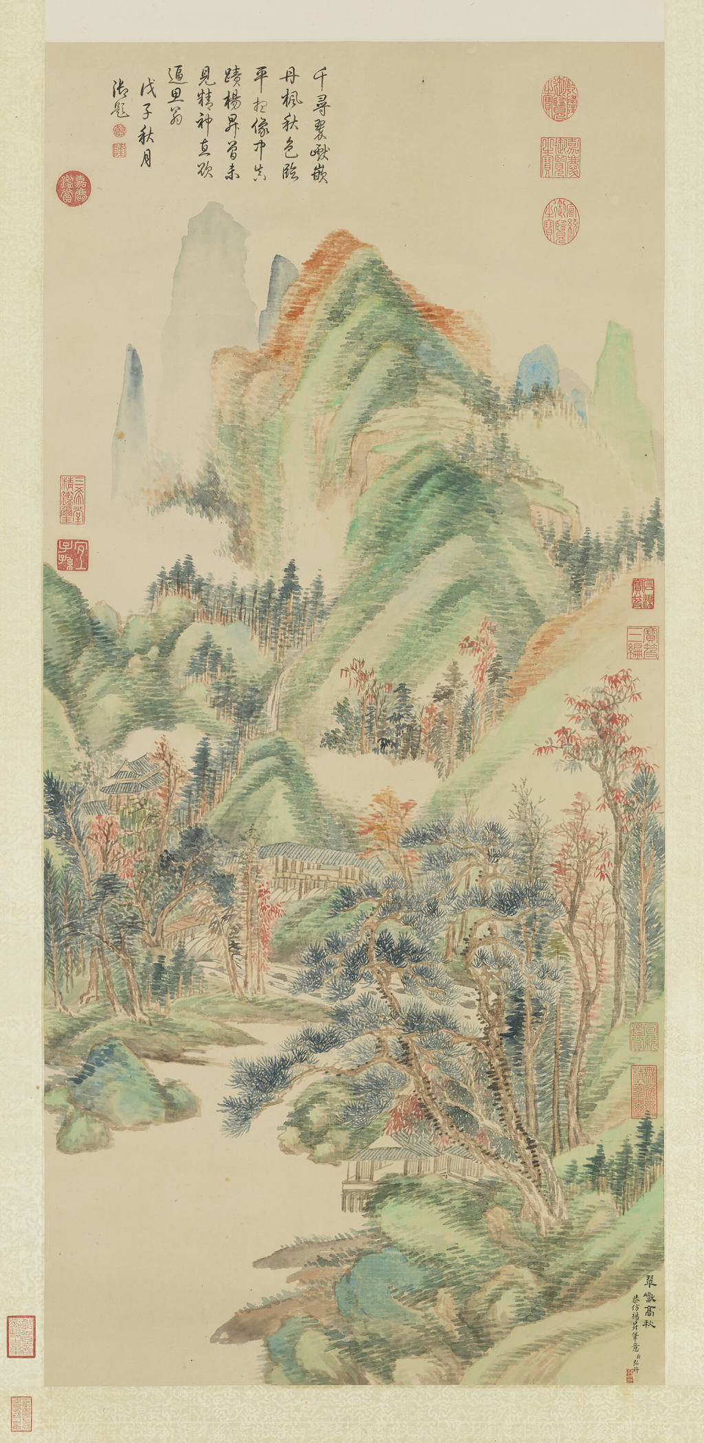 弘旿(1743-1811),字卓亭,号恕斋。清宗室中擅书画者,每逢年节常有作品进献。画中层峦叠翠,秋叶点缀其间,色彩缤纷绚丽,一派秋高气爽。自题仿唐朝杨昇(活跃于714-743),然与明末没骨山水较为近似。