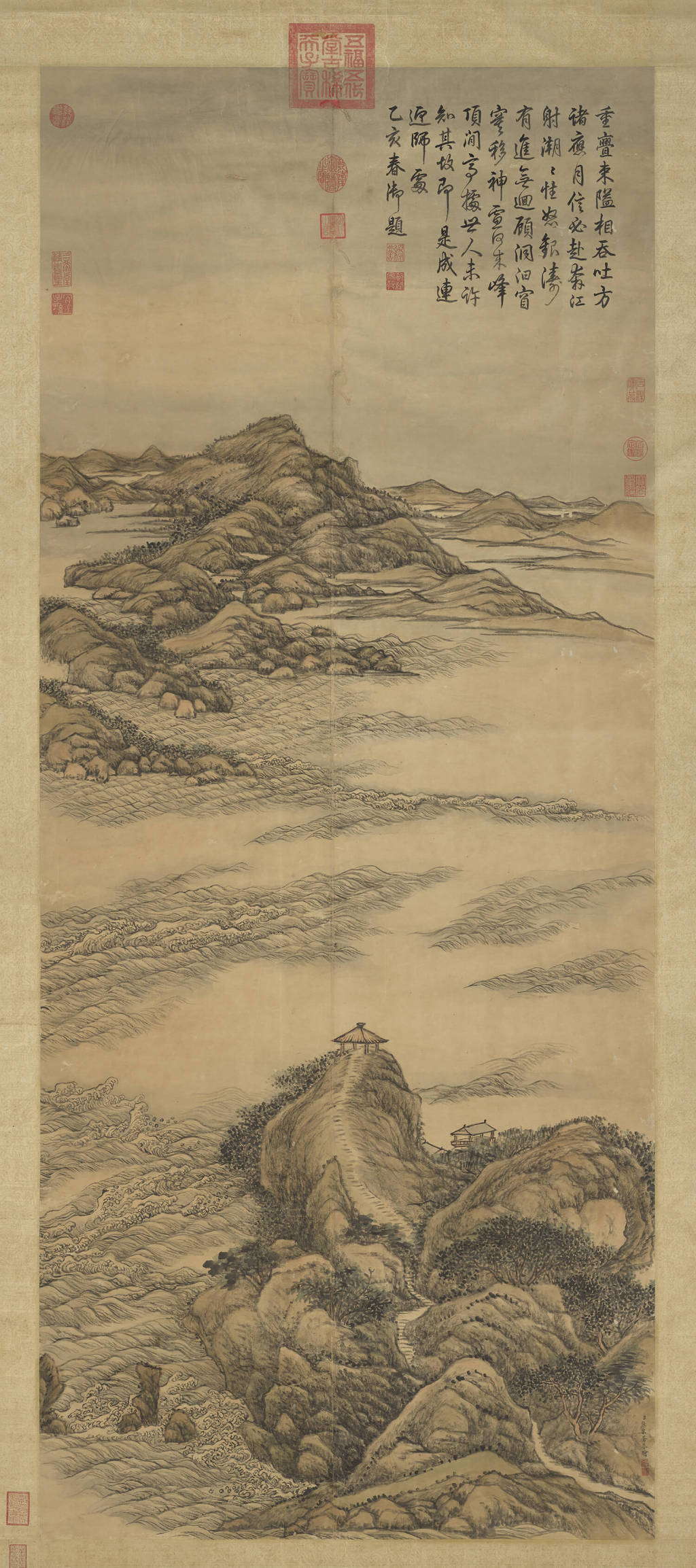 张宗苍(1686-1756),江苏吴县人,字默存。善山水,王原祁(1642-1715)再传弟子。画江潮壮阔,山峦重重,波浪汹涌,激起银色怒涛。