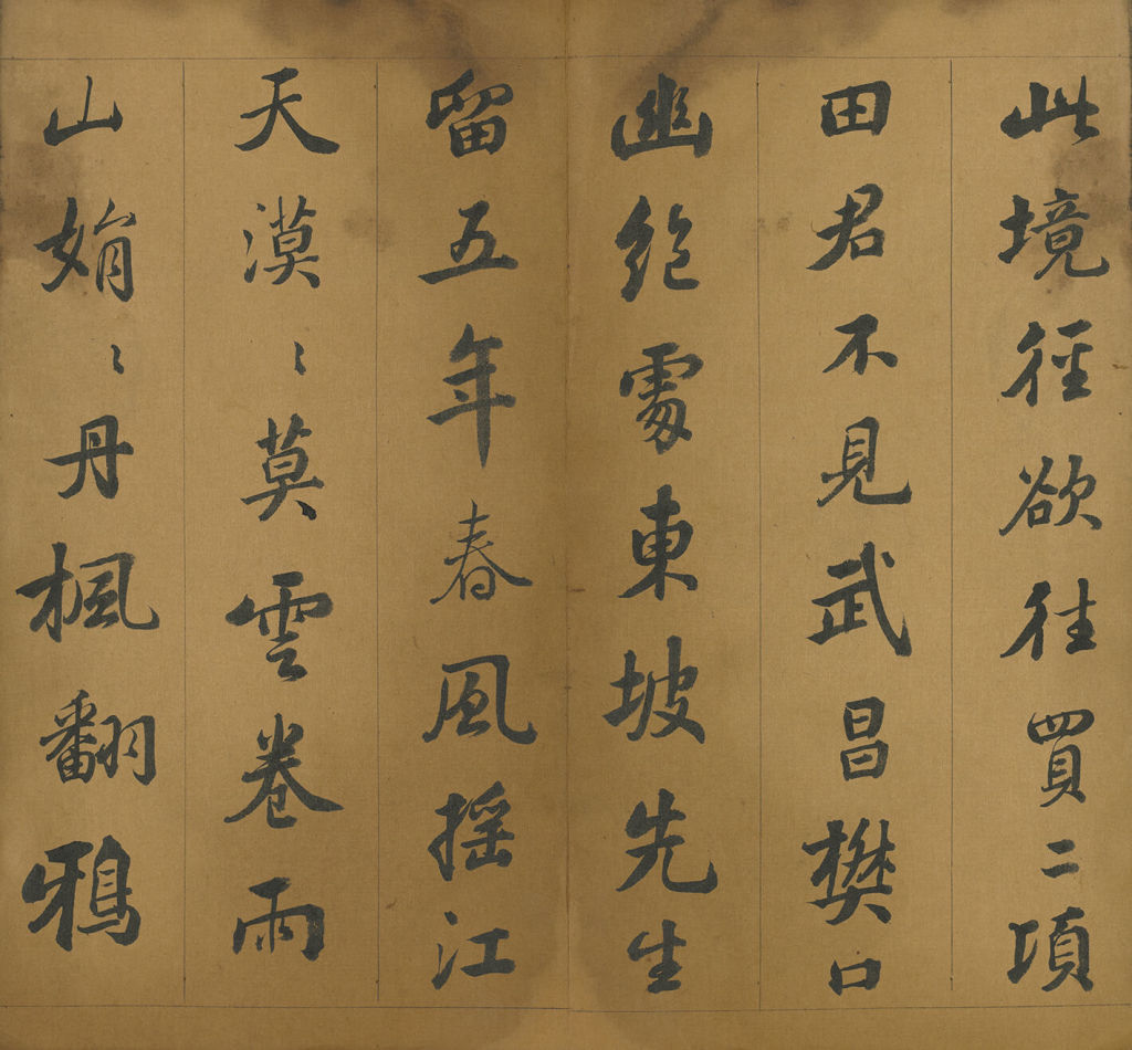 张照此册虽名为临苏轼(1037-1101),却多表现自家面目,仅有少数点画出现苏体特征,体现董其昌(1555-1636)的意临概念。整体下笔沉稳,书写流畅,线条苍劲厚重,墨色变化自然,为当时宫廷书家之代表,受到乾隆皇帝极高的推崇。