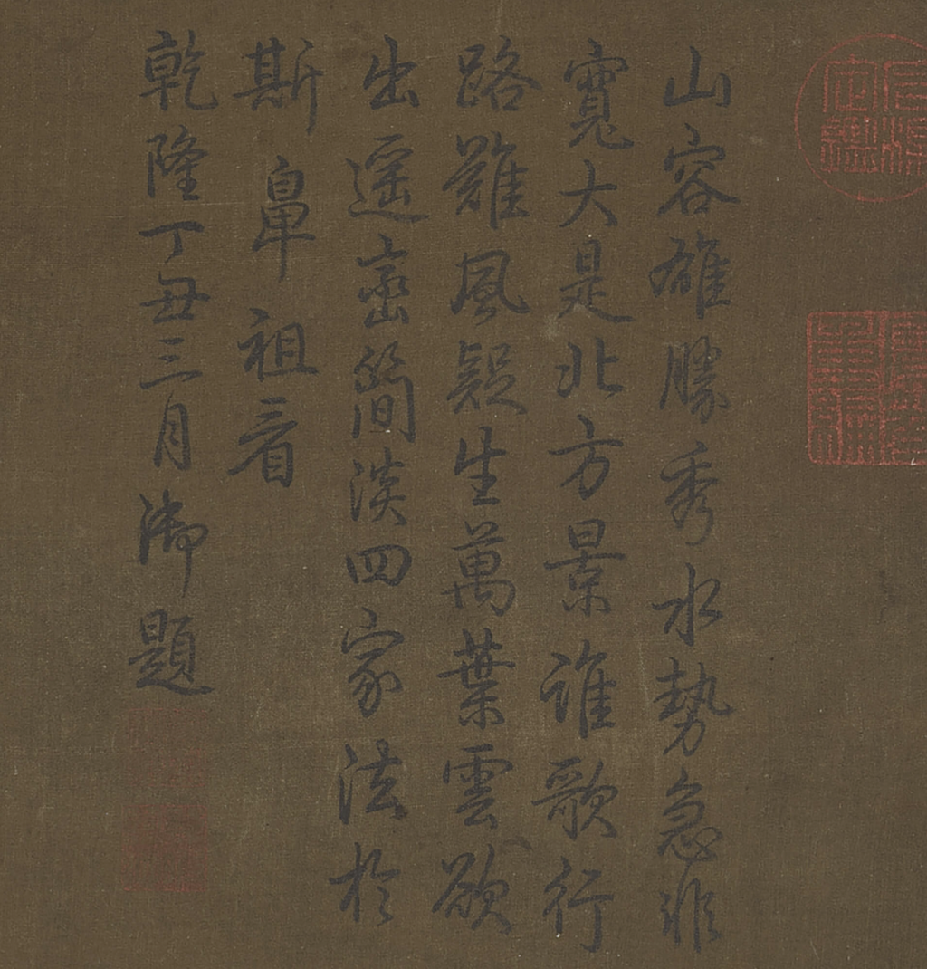 题诗书写于乾隆二十二年(1757),表达皇帝对于风格和技法的赞赏,显然认为高出《谿山行旅图》真迹。整体用笔与结构虽然不算差,单字外形相当接近此时期代笔书家汪由敦(1692-1758),然细微处的处理仍不够完善,整体线条亦显得较弱,为皇帝亲笔。