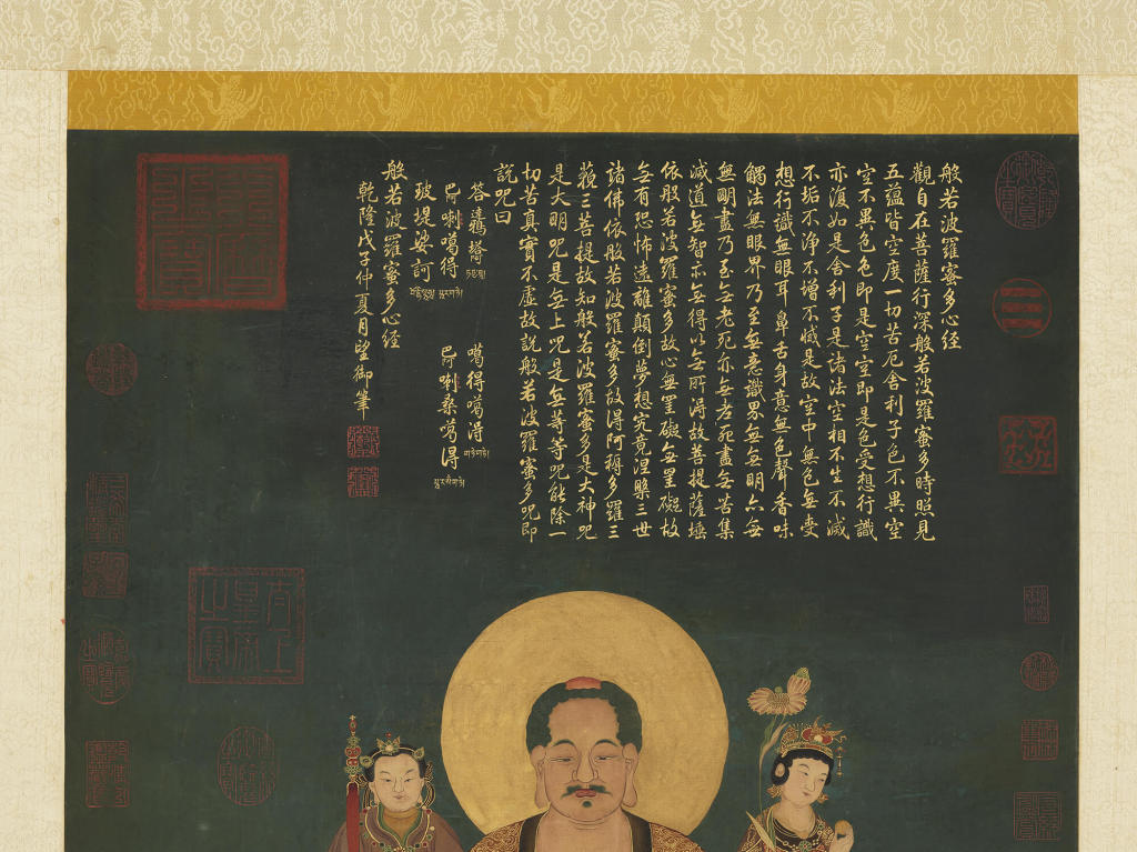 于敏中奉勅写于乾隆三十八年(1773),与《宋人画无量寿佛》上所代笔的心经,无论起收笔的细致动作、线条的提按变化或字形结构的偏好上,都能看出为同一人所书。