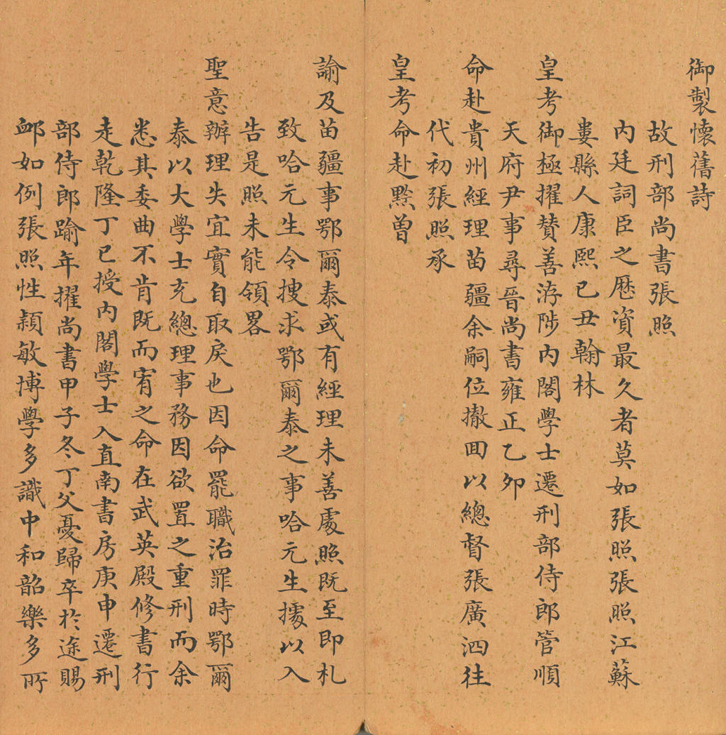 此小楷《御制怀旧诗》为乾隆晚年代笔董诰(1740-1818)所书,用笔细劲秀逸,结字端正优美,体势宽博舒展。内容为皇帝对张照(1691-1745)的感怀诗文,也对其一生功过做出评价,言语之间,充分表达出对其书法的欣赏。