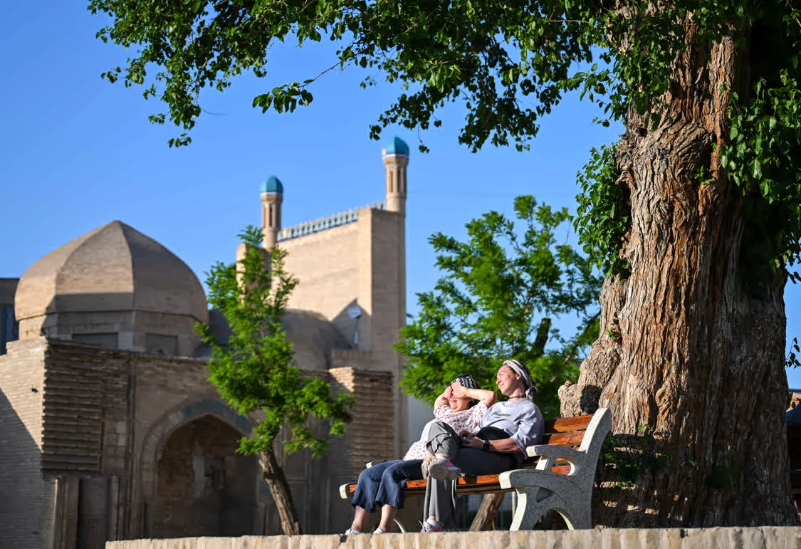 4月24日,人们在乌兹别克斯坦布哈拉古城内享受阳光。新华社记者 李任滋 摄