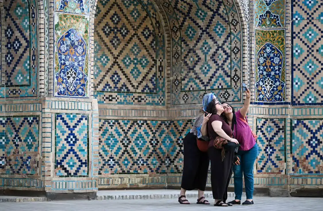 4月24日,游客在乌兹别克斯坦布哈拉古城内自拍。新华社记者 李任滋 摄