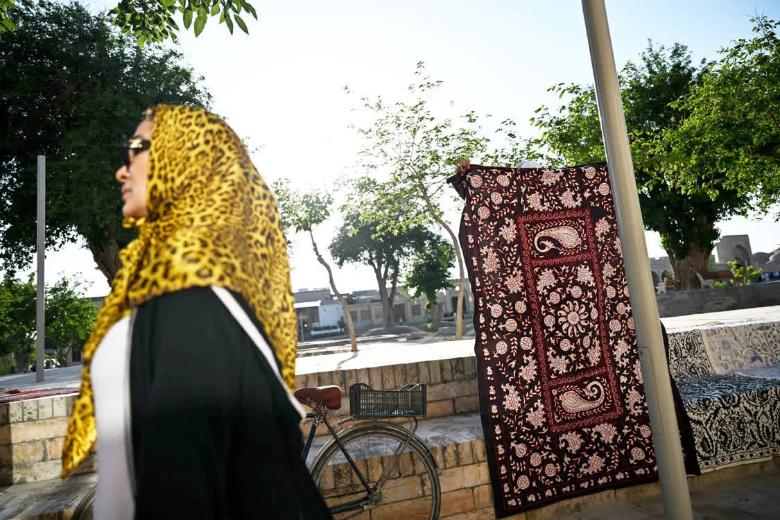 4月24日,在乌兹别克斯坦布哈拉古城,一名女子从在整理手工地毯的商贩(右)前经过。新华社记者 李任滋 摄