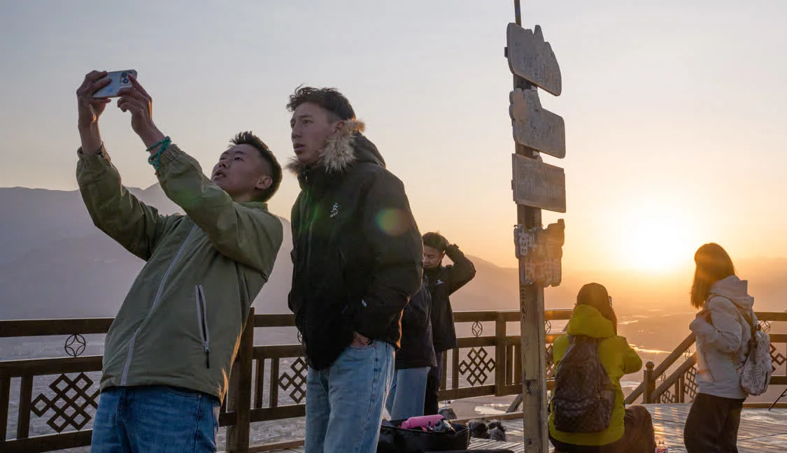 4月26日日出时分,游客在拉萨市南山公园拍照。新华社记者 丁增尼达 摄