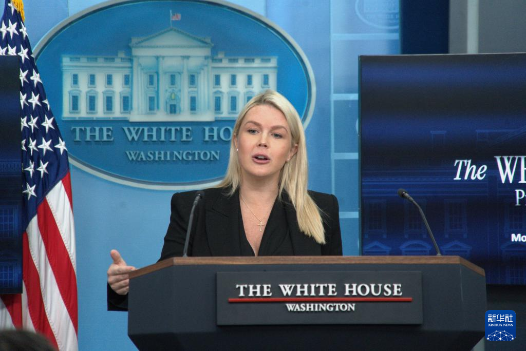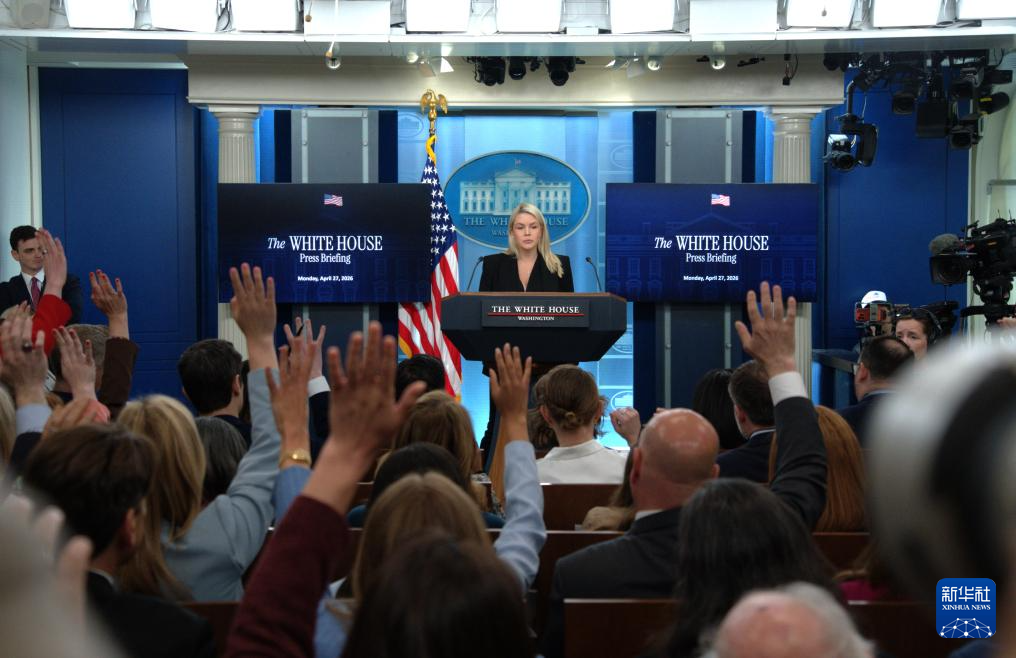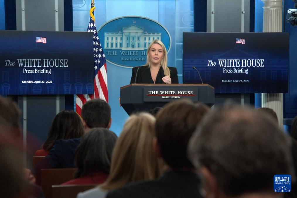 4月27日,在美国首都华盛顿白宫,白宫新闻秘书莱维特出席记者会。新华社发(李源清摄)