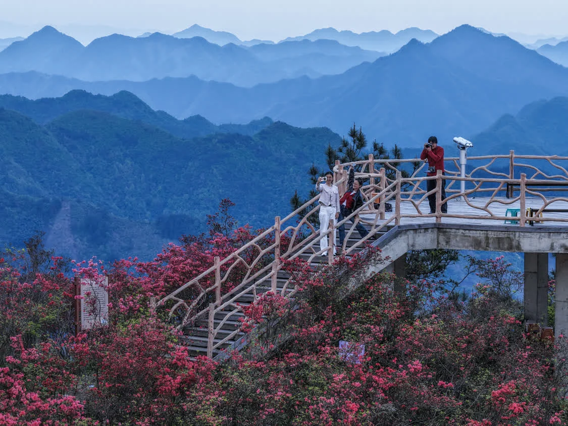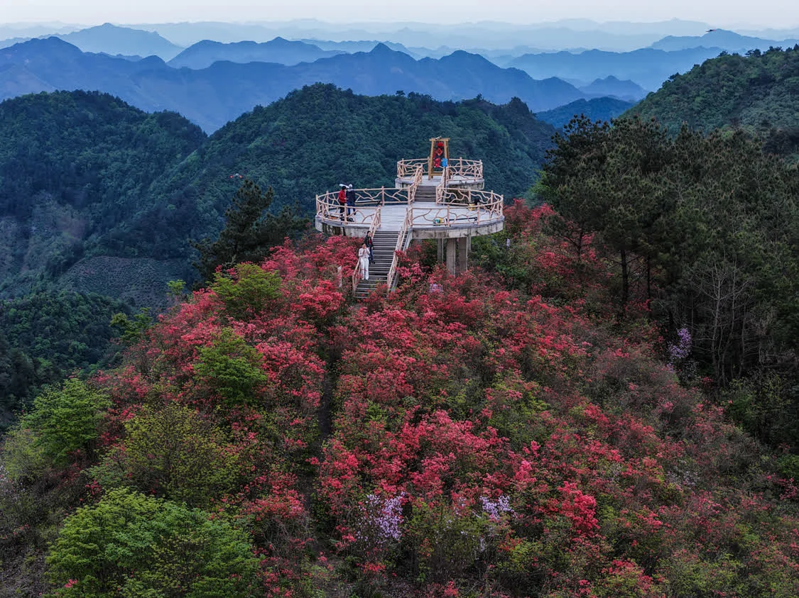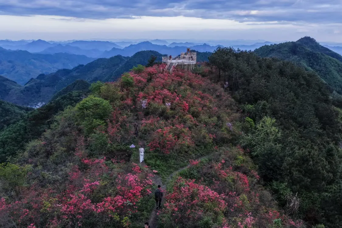 近期,浙江省杭州市淳安县屏门乡金陵村的数百亩高山野生杜鹃热烈绽放,吸引各地游客前来观赏。淳安县金陵村海拔1000多米,是淳安海拔最高的村落之一。近年来,该村依托高山上自然生长的数百亩杜鹃及茶叶、茶油、竹笋等特色农产品,通过修缮盘山公路、开辟露营基地、搭建观景平台、发展共享民宿,逐渐形成以登山观景、避暑养生为特色的农文旅产业,带动山村村民增收致富。